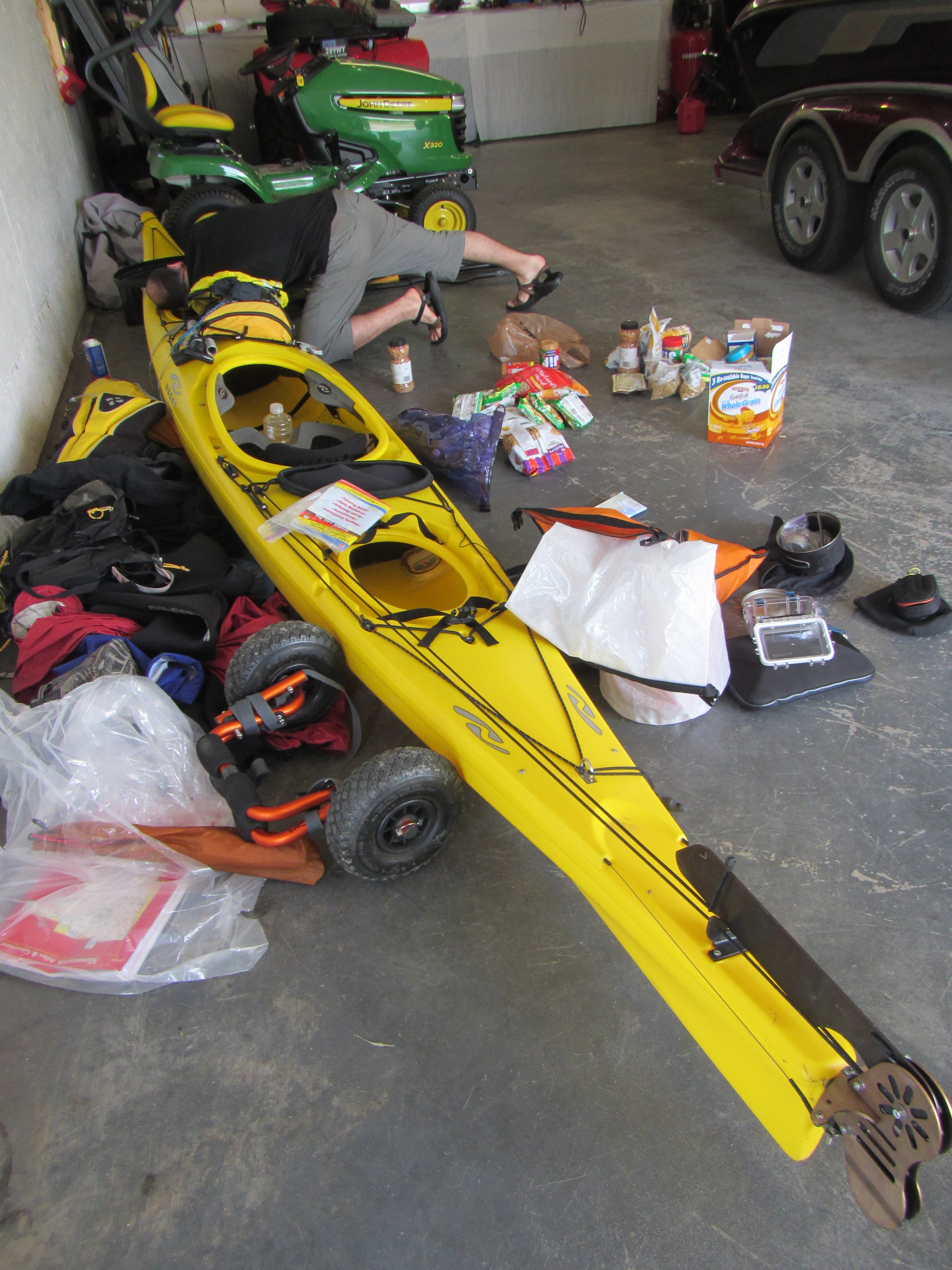 The kayak exploded open like a pinata, spilling a hundred pieces of gear instead of candy. A lot of chaos comes in and out of two long hatches. My equipment covered half the Pavleck’s garage. I dropped ten days of food next to it and began to pack.