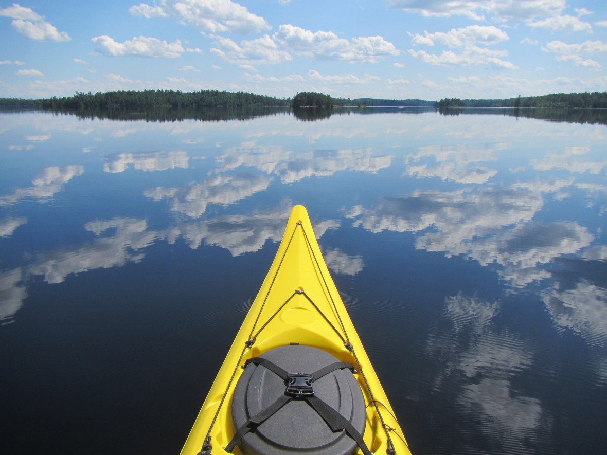 The still air leaves Crooked Lake’s surface a sheet of glass. The Looksha’s hull cuts through reflections of puffy white clouds and blue sky. It feels like flying.