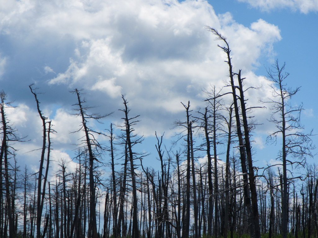Around the Granite River, fire has eaten everything, leaving only trunks to twist into the sky. Some are bone white like the rib cage of a carcass picked clean.