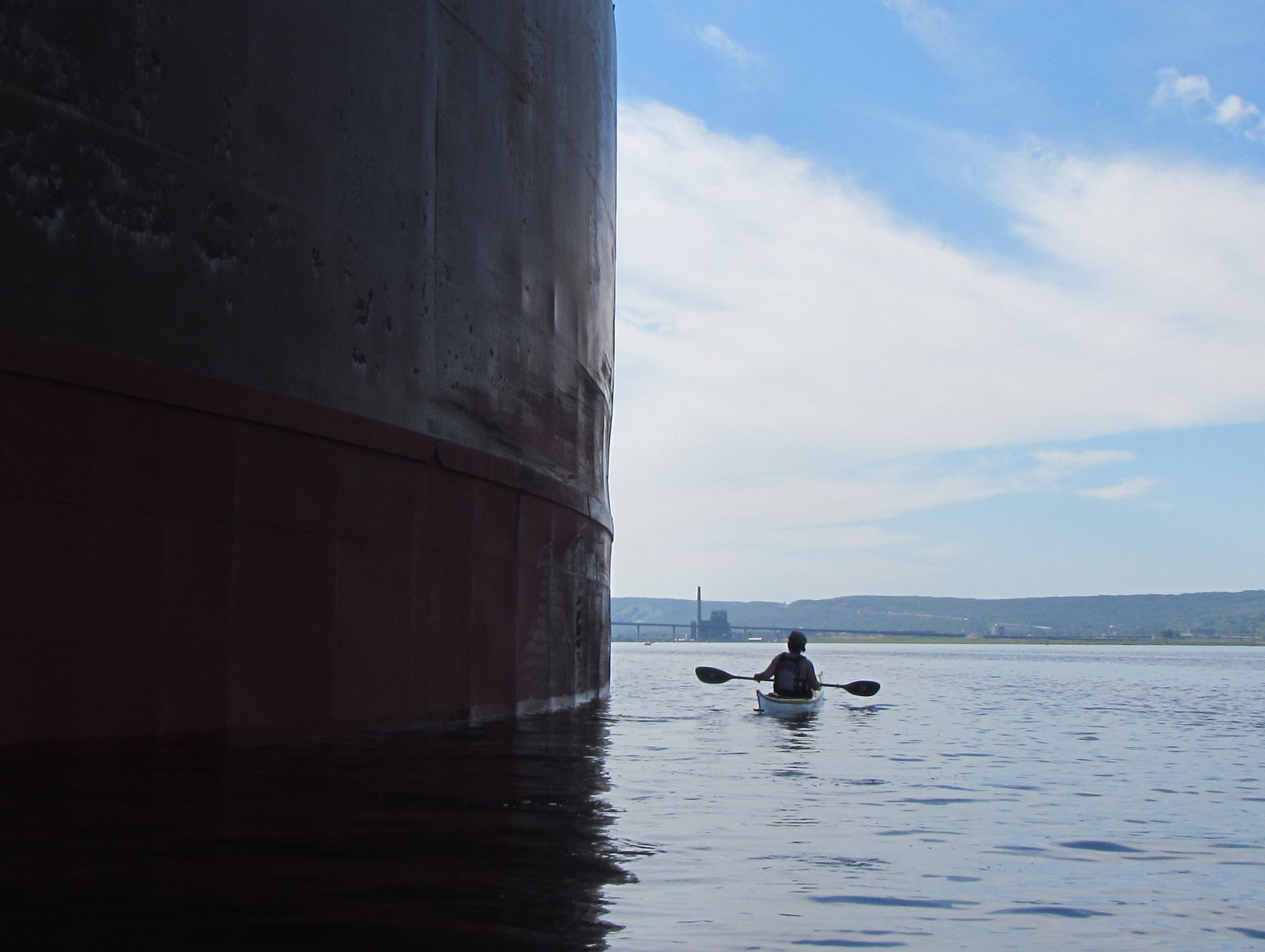 Duluth’s harbor is a maze of industry. Giant grain silos rise into the sky near ore docks, piles of coal form black mountains, a thousand vessel visits a year move 40 million tons of goods. From a kayak all you see is a tangle of docks and the hulls of freighters rising like steel cliffs.