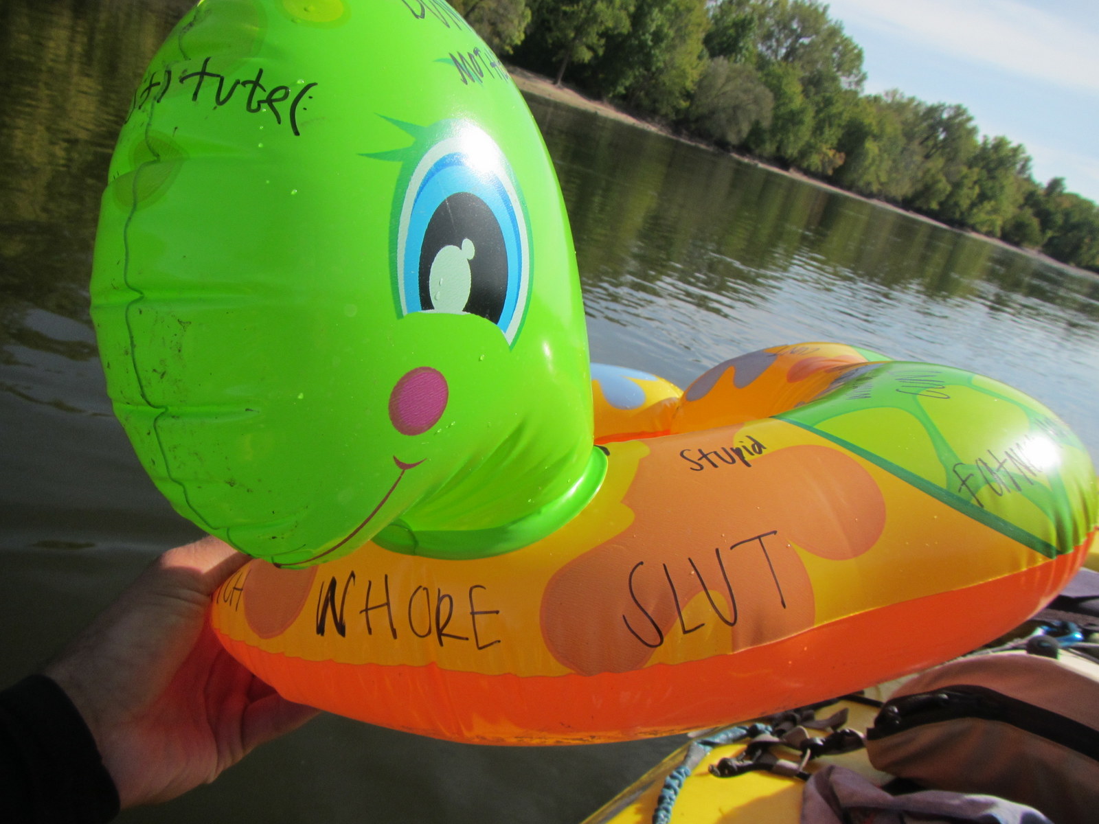 I’ve found all kinds of things along the shore of the Mississippi. I found an old milk jug like they use in carnival games at the state fair. I found rusted out cars and bicycles. I found a basketball which I picked up and then lost half-a-day later when it rolled off the boat and floated away again. I even found a turtle float with dozens of insults written all over it in permanent marker, things like “whore,” “prostitute,” and “slut.” I have no idea what that turtle did to deserve all those names, I can only imagine it was enjoying life so much that the other turtle floats got jealous of all the fun it was having.