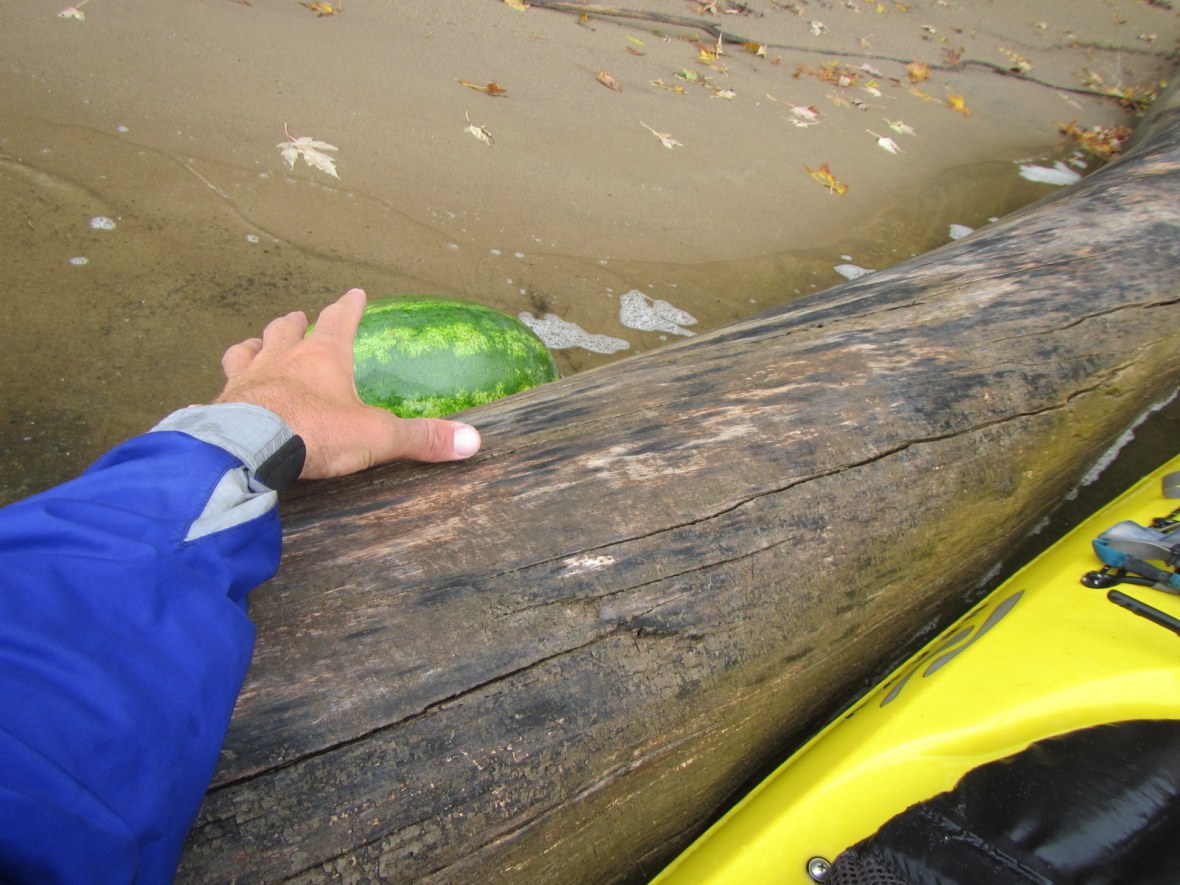 I found it floating in the river next to a log along the shore a few miles downstream. It’s bright green skin glowed against the dreary day. I picked it up, examined its shell for any breaks, thumped it twice, got a nice hollow return, and put it between my legs in the cockpit of the boat, the only spot with any room left for a giant melon.