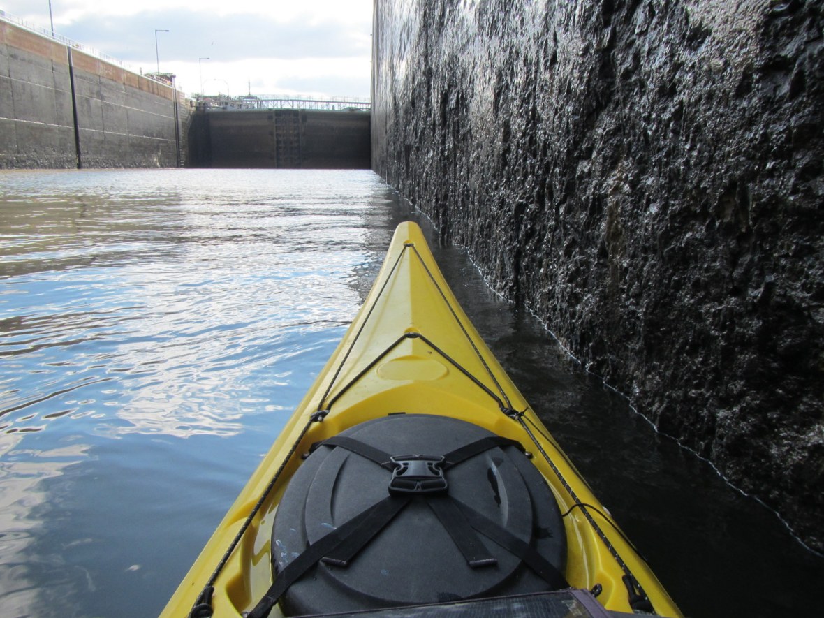 Twice as big as the other locks, Lock 19 felt like a lake all its own. About halfway down the man directed me to a metal float embedded on a track inside the concrete.