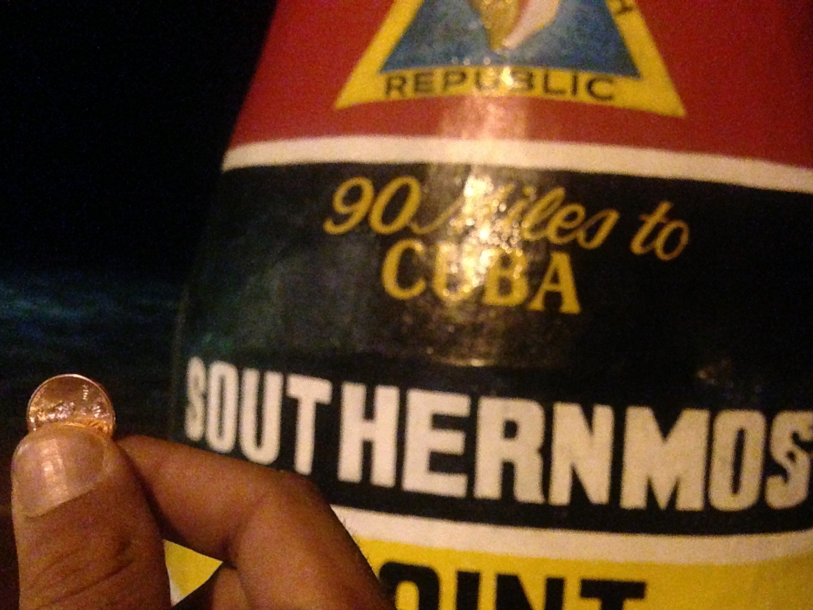 The Southernmost Point is quiet after dark. The line of people waiting for pictures disappears and the giant painted buoy watches the ocean in silence. The water’s rough, splashing up and onto the sidewalk. I feel the coin in my pocket. I think it’s heavy for a penny.