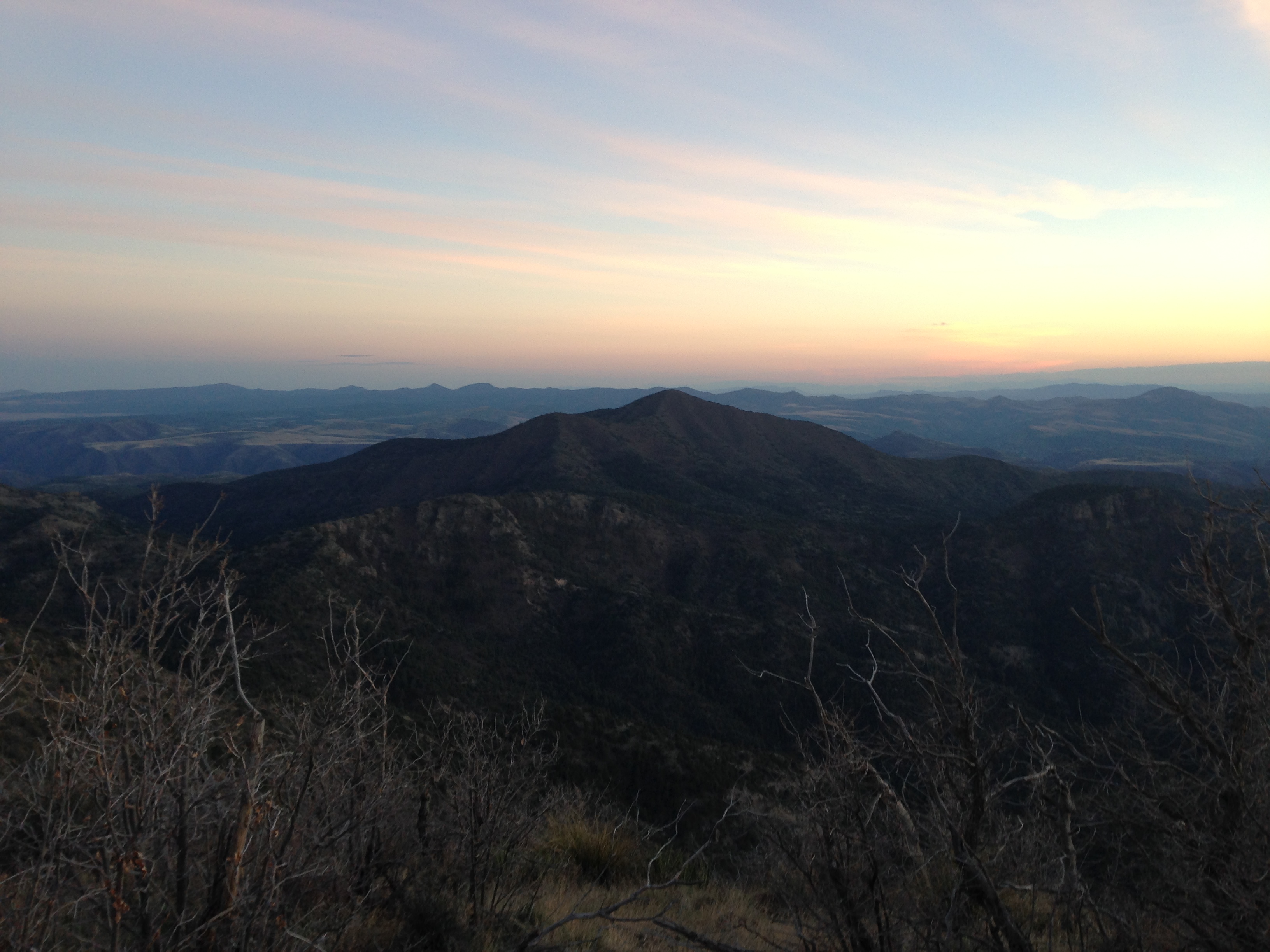 The sun reached the horizon while I stood a few hundred yards from the peak in a tangled thicket of branches, catching my breath again. I caught my breath and crashed my way forward. The last rays of light filled the sky with a mix of red, orange, and purple. Mountain tops rose in the distance. They looked like frozen shadows of an ocean in the dying light. The sky above me faded into a dark blue and black, twinkling with the night’s first stars.