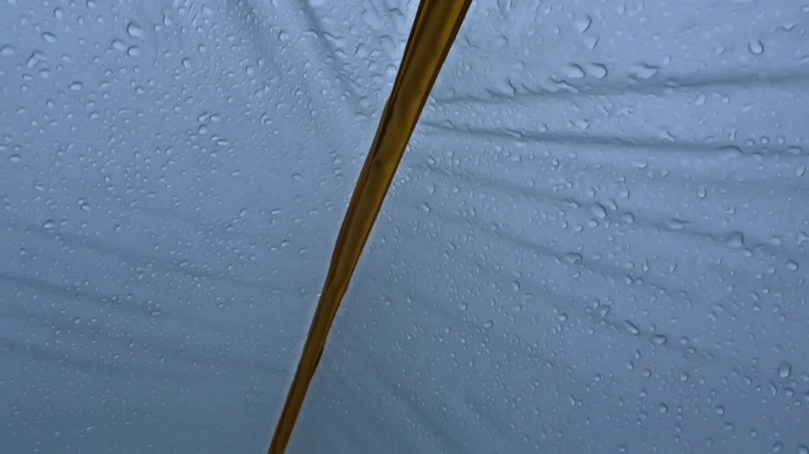 I don’t move. I only sit in my small rectangle of fabric and netting, staring out at the falling rain, listening to the the drops pop against the walls, watching the water pool into little rivers that run down seams to the ground.