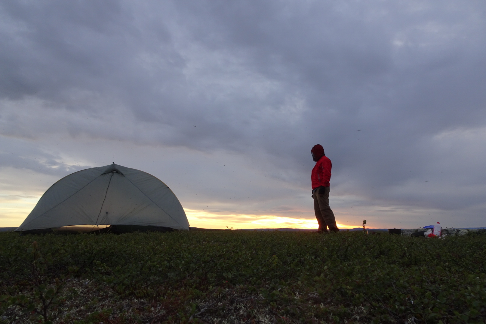 I walked on, coming to a ridge near midnight, the low sun setting the clouds ablaze with a purple fire as the first drops of rain fell on my tent.