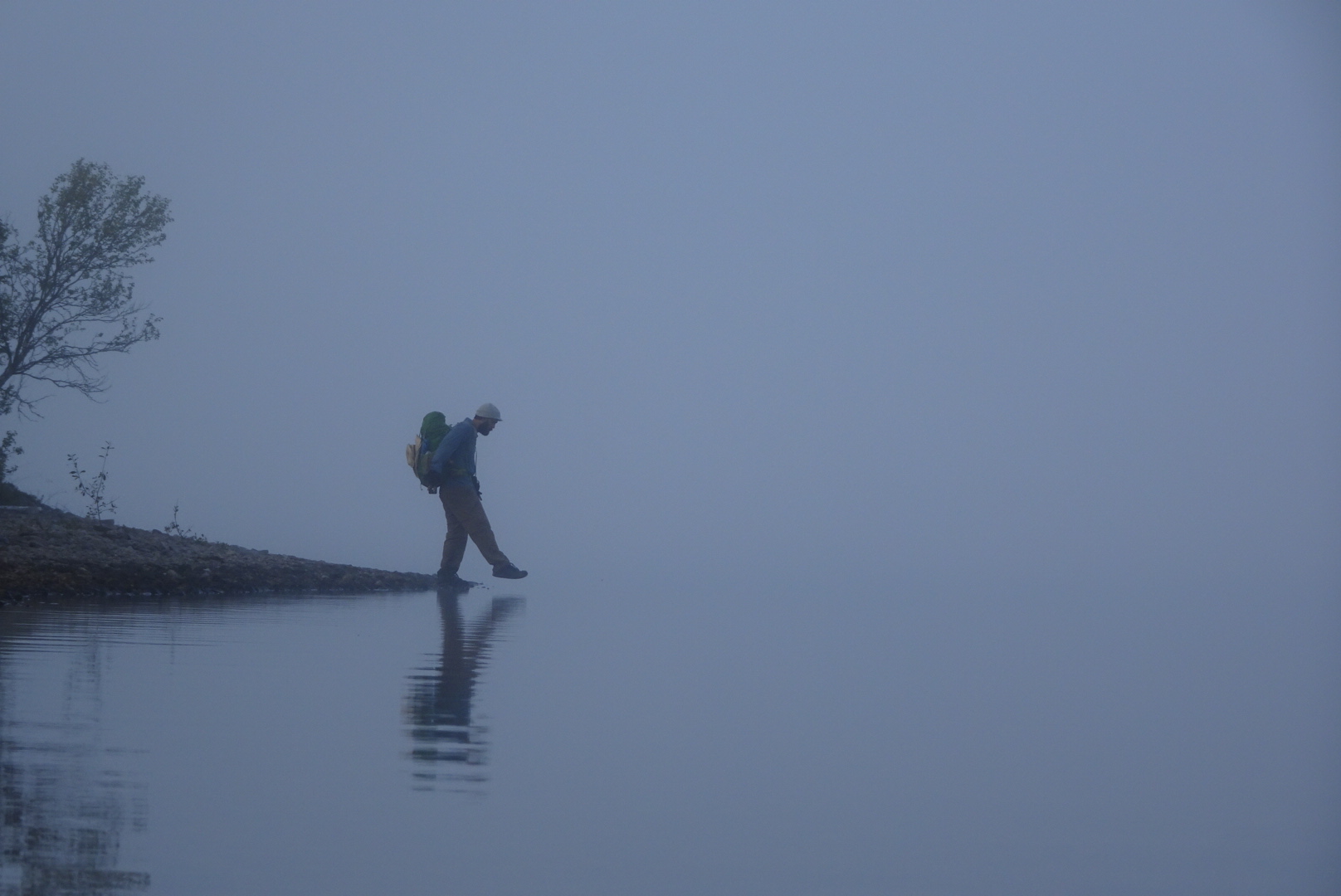 The lake and sky look the same in the fog. The still water catches the grey and reflects it back on itself, swallowing the horizon, turning the world into a colorless canvas stretched in front of my eyes.