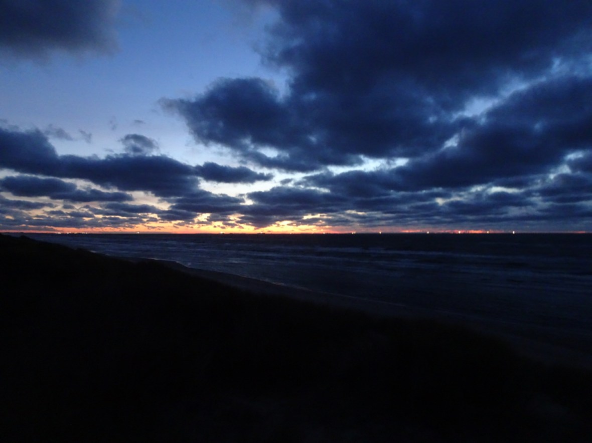 The sun rises as I walk, swallowing the ships’ lights, leaving the silhouettes of their hulls, and revealing the arc of the coast stretching south. I can see Frederickshavn, hazy and far away.