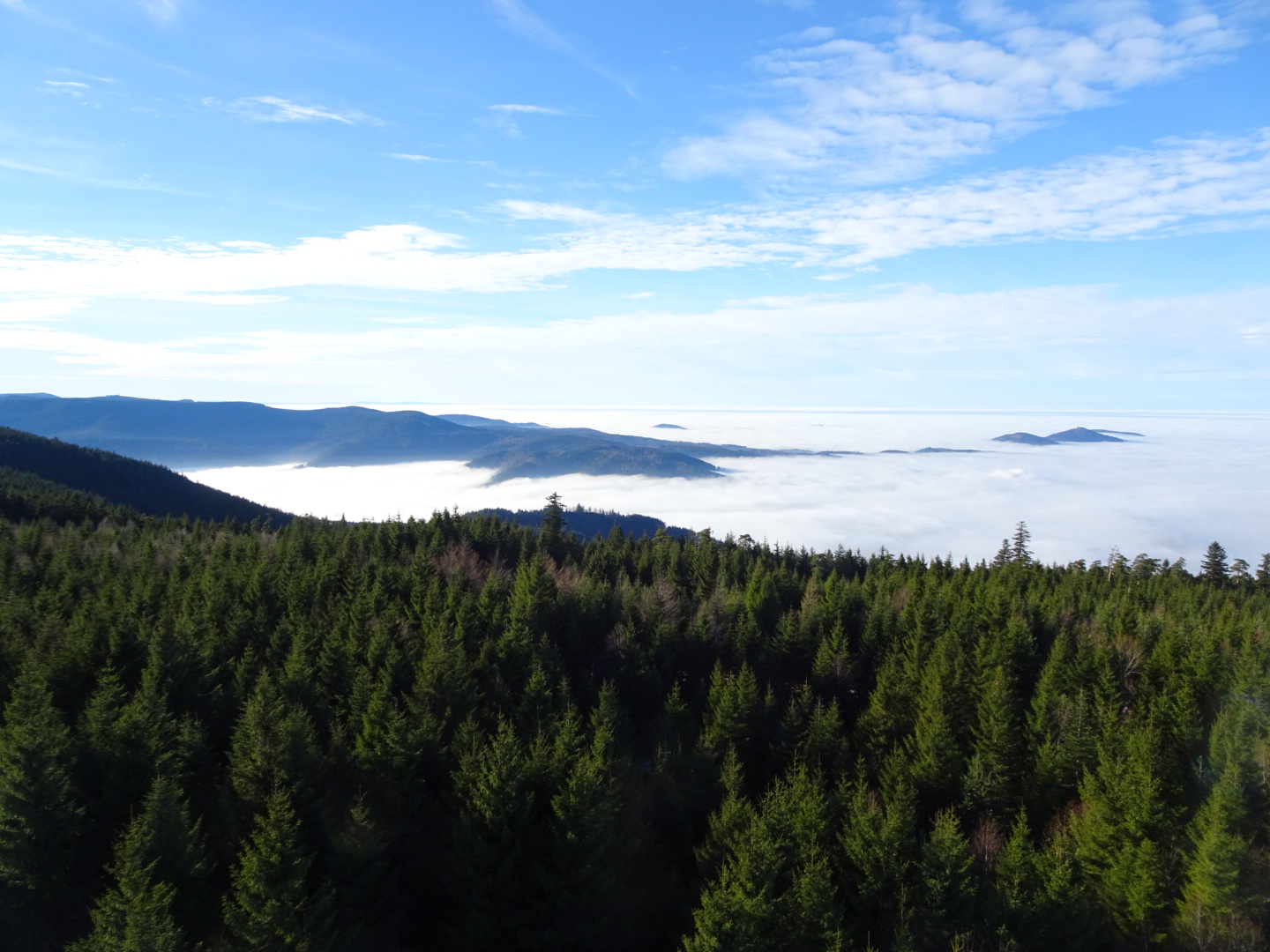 A sea of clouds stretched out below me, filling in the lowlands across the horizon, leaving only mountain tops to rise like islands. It seemed conjured out of imagination, splitting the world, not north and south or east and west, but up and down, leaving sunlight up high and winter below. I kept looking across the puffy white sea as I walked, half expecting a flying ship to rise above it, sails unfurled in the wind.