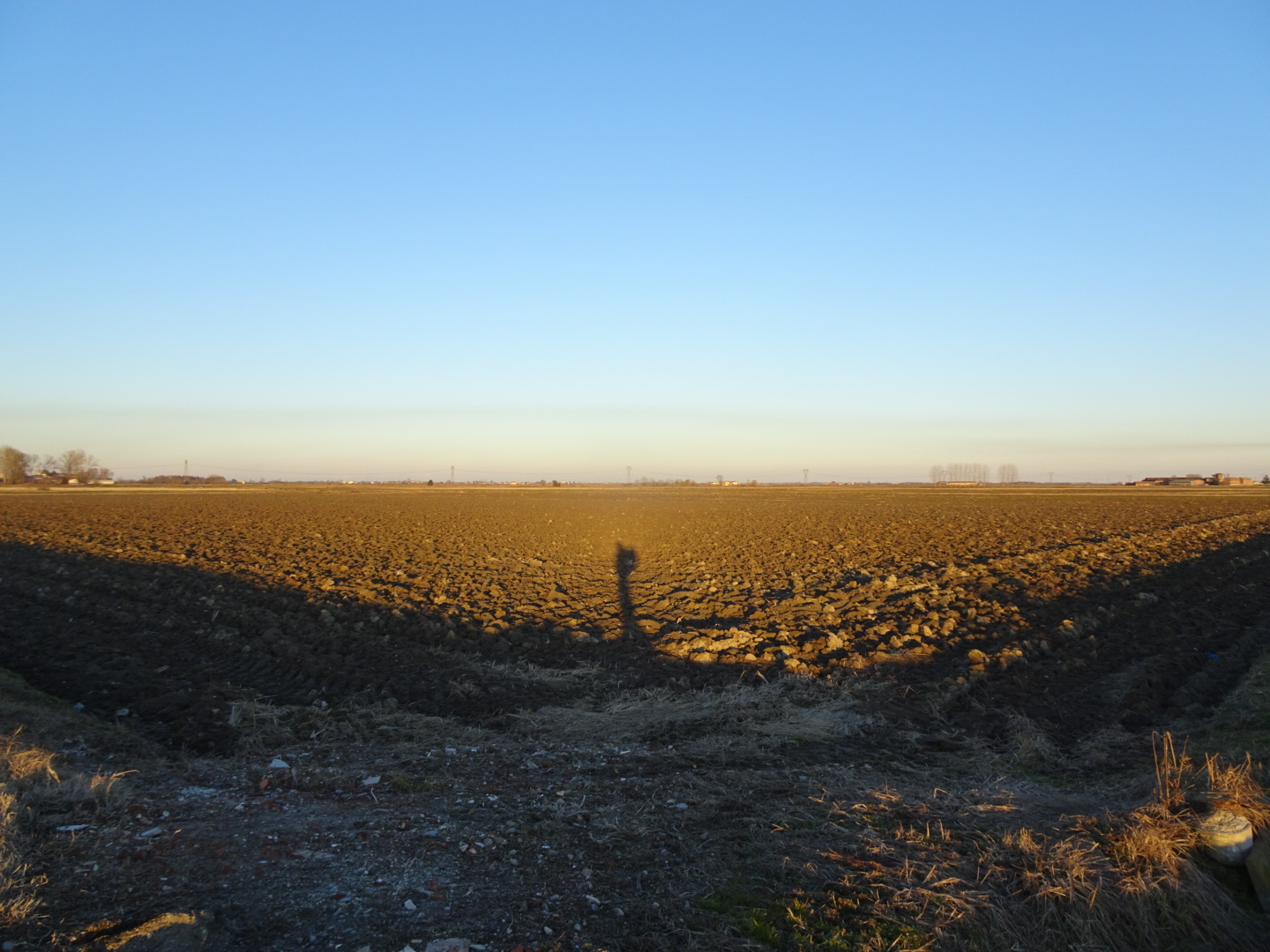 The road stretches south from Vercelli, flat and unforgiving. No sidewalk, not here where the city crumbles away. I walk along the shoulder, then find a short section of abandoned pavement that will buy me a few hundred meters before it joins the road again. A fruit stand sits at the junction in the distance, the last bit of the city, just a truck and a bunch of crates set up at the edge of town. Fields, empty for winter, stretch away to the horizon.