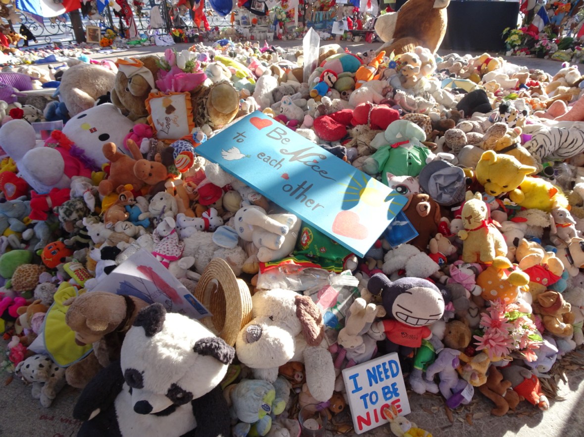 There’s a circular pavilion halfway down, just off the promenade in a park. It’s filled with stuffed animals, flowers, handwritten signs and notes, flags, candles, and pictures. There are thousands of things, stacked in piles and placed all around inside and out of the structure, all left in memory of those who died when a terrorist drove a truck down the promenade last summer.