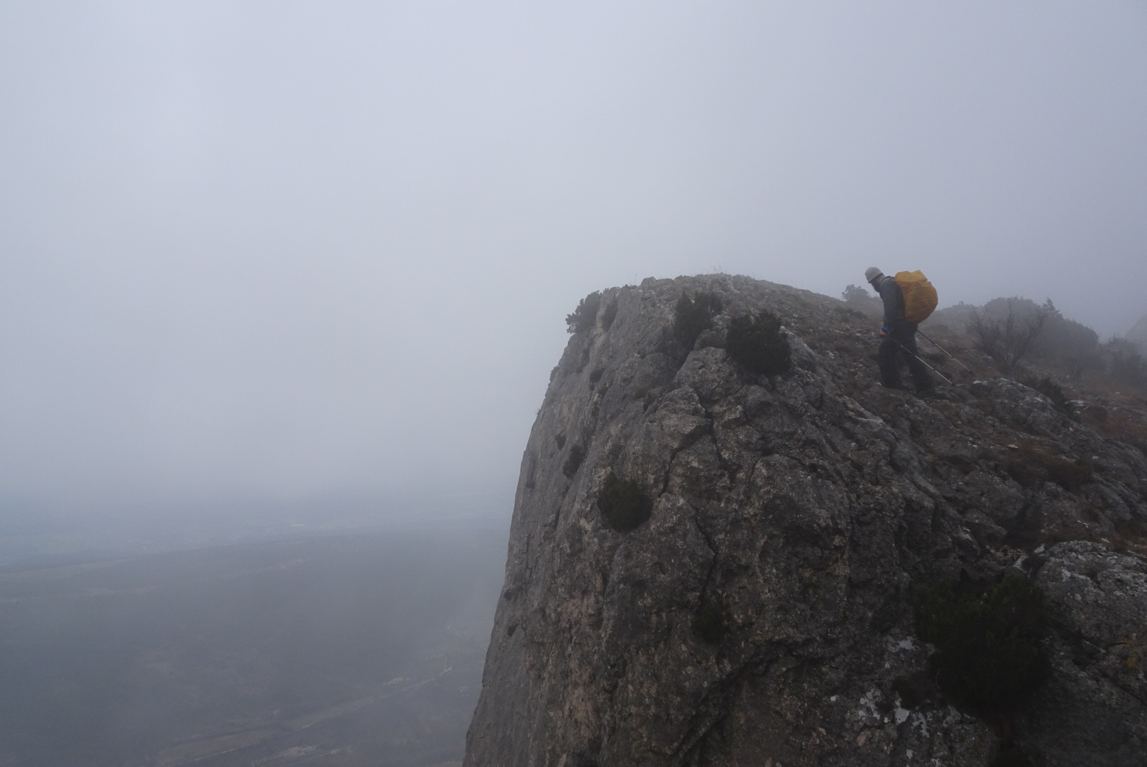 As the ridge drops, the wall of grey begins to fade. Shadowy rocks loom upward. The cliff stretches down. A faint expanse of valley swirls in and out below.