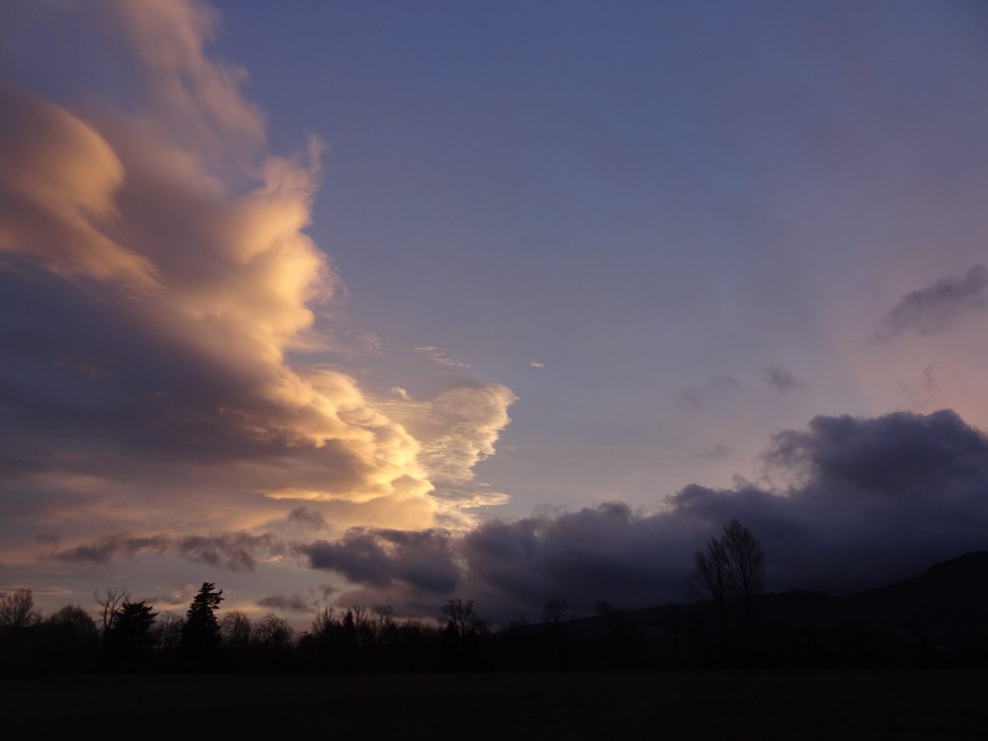 I walk as the sun rises and brightens the world. I walk as the day stretches on and light filters in between towers of clouds overhead. I walk as the sun sets in a pink sky and gives way to to the moon rising on the opposite horizon. Then I walk a little more, through a sleepy old town glowing in electric lights, past dark farmhouses, and down old dirt roads until I see the city of Castres glowing along the horizon and the last curves of mountains fading in the moonlight.