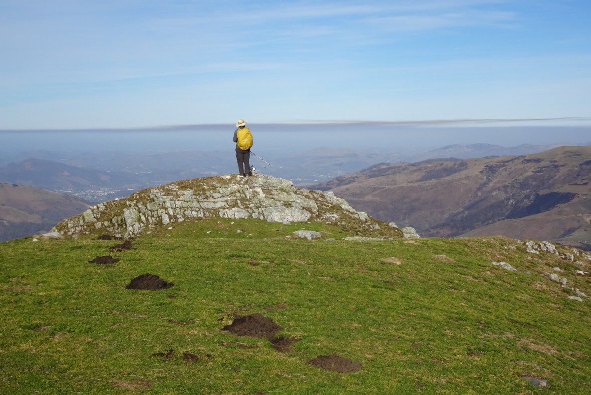 The Pyrenees stretch back in a long line, the barren, rounded tops rise to jagged, snow-clad peaks in the far distance. I walk the last few steps to the top of the mountain then turn, staring out at everything, the flat lands, the valley with Saint Jean, the chain of mountains running east to west, the smoke billowing up from a fire on the far side of a ridge, the Napoleon route in the distance, free of snow and still closed, the low route snaking somewhere in the valley below, the horizon, hazy with smoke, curving away. The whole world is there, stretched out around me.