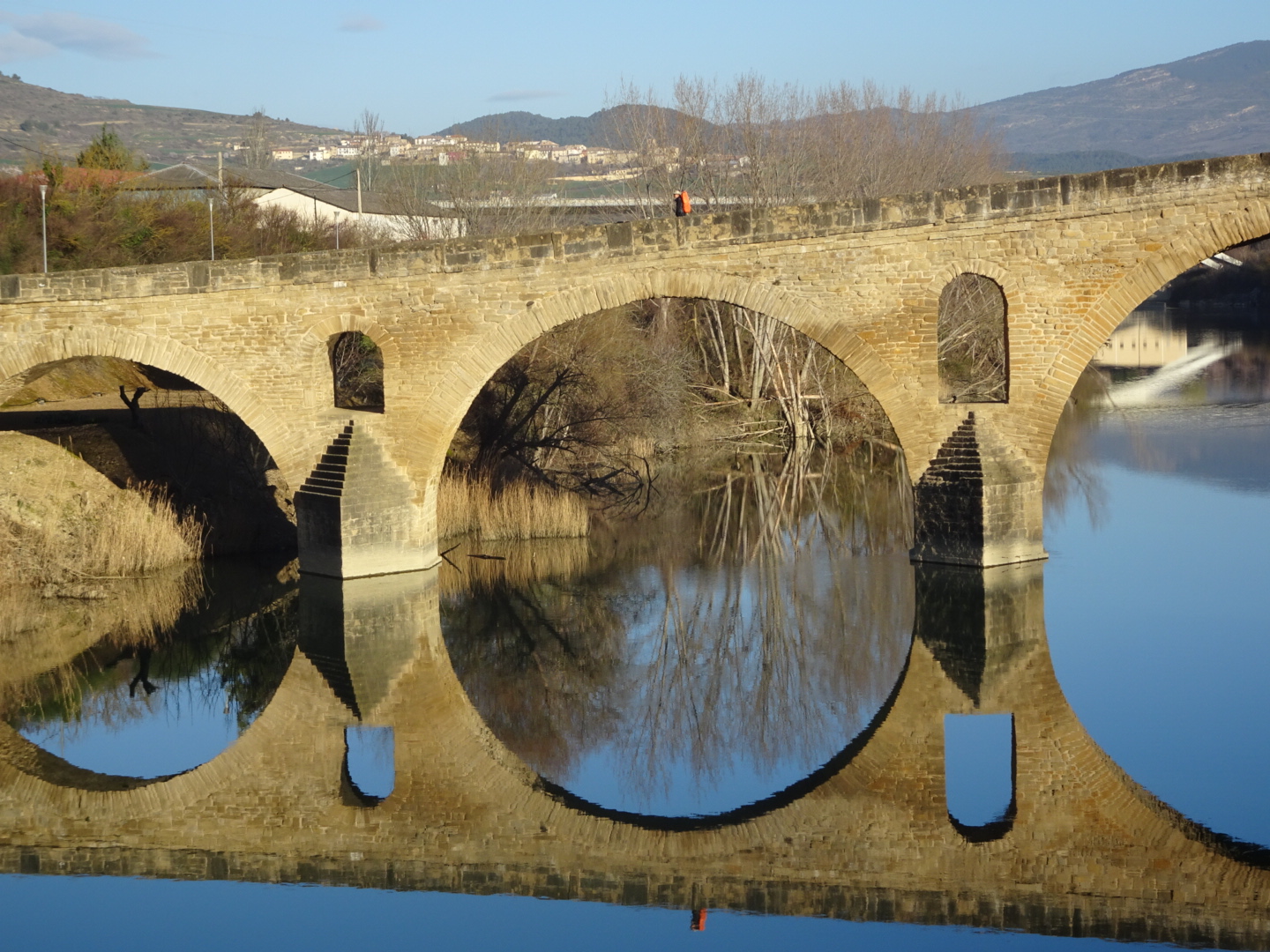 The water stands almost still below the bridge, mirroring the curved arches in the early light. A queen built it for pilgrims on the road almost a thousand years ago. Different routes converge here, one from the north, the other from the south, and pilgrims needed a safe passage over the river Arga. They still do. The bridge and town carry her legacy in their name, Puente de la Reina, the Queen’s Bridge.